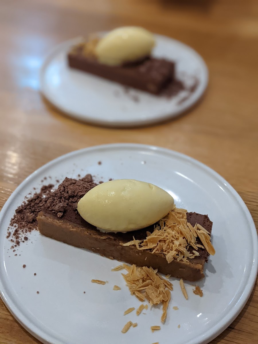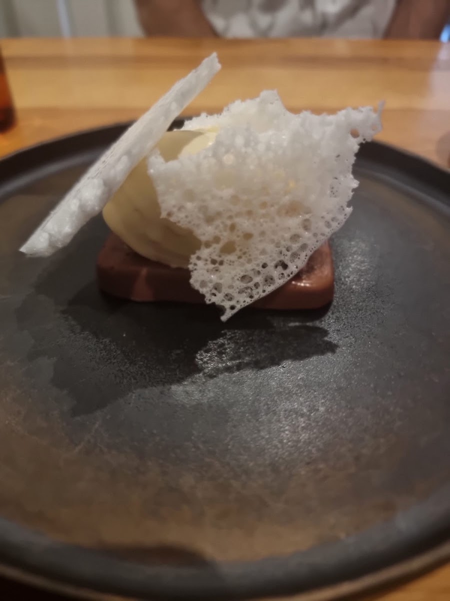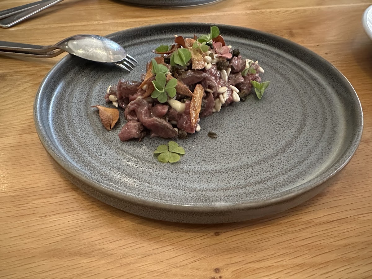 We had a fantastic meal at Tulip last night. I ordered the degustation menu with wine pairing so that I wouldn’t have to think too hard about what to order. They nailed the food. Every dish was small but packed with flavour. My favourite was the lamb which was delicate and tender with a delicious smokey lamby flavour. The chicken fat butter that accompanied the bread deserves a mention too. I’d like to bottle it and take it home. The paired wines and beer were perfect. I requested to have only local makers and they delivered perfectly matched wines throughout the meal. The service was excellent. We were served by a few different staff members who all spent time to talk to us about what we were eating, drinking or anything else we asked. They were not rushed and didn’t interrupt our conversation. The final note was the venue itself. The entry from outside is through a gorgeous courtyard the looks like an Italian villa inclusive of a water fountain. Inside is a lovely space with wooden furniture and an open kitchen full of fire and food. We will definitely return.