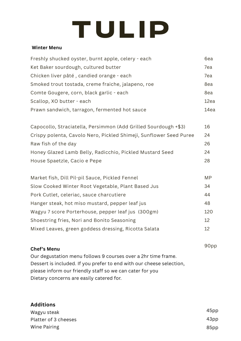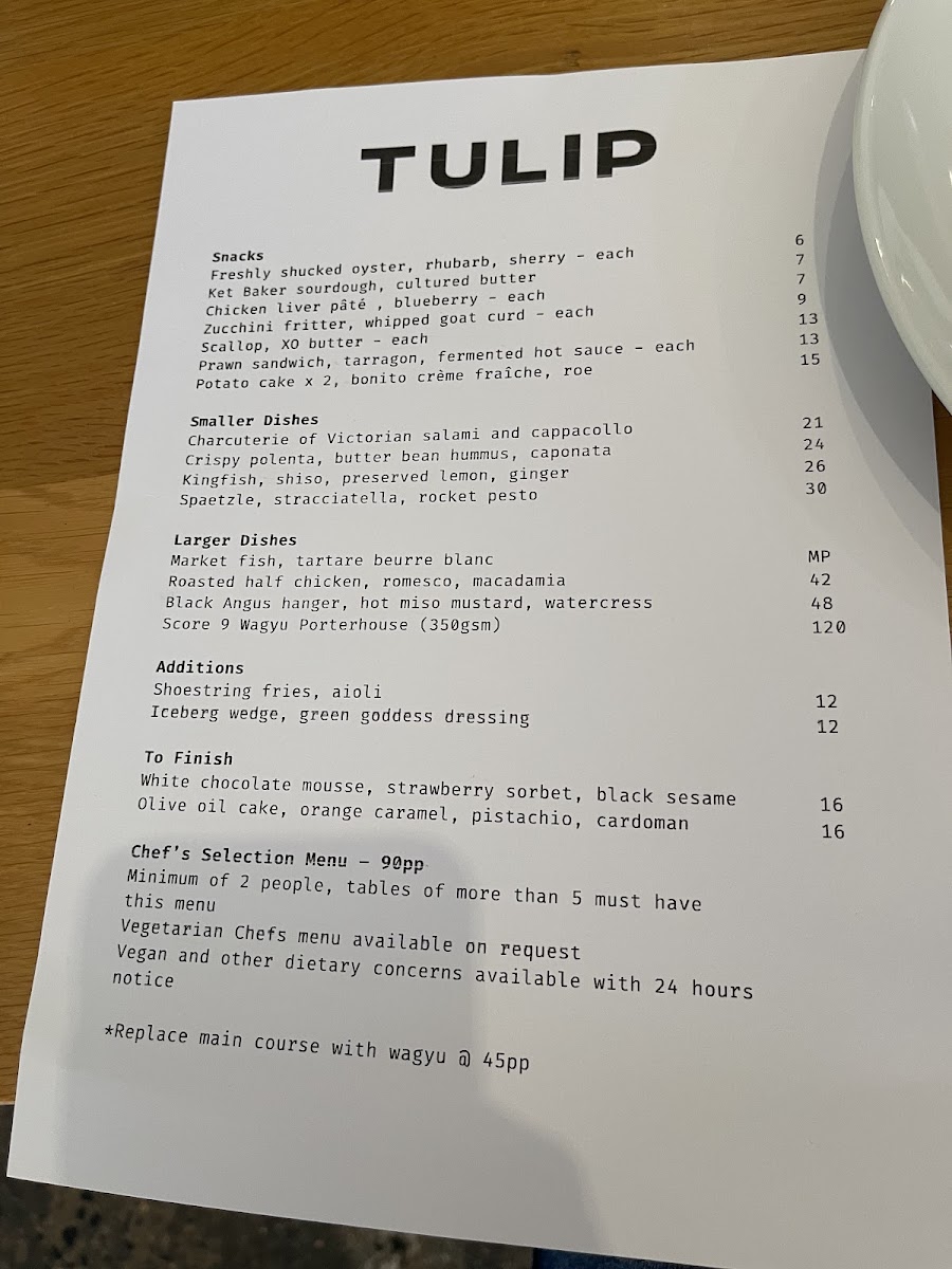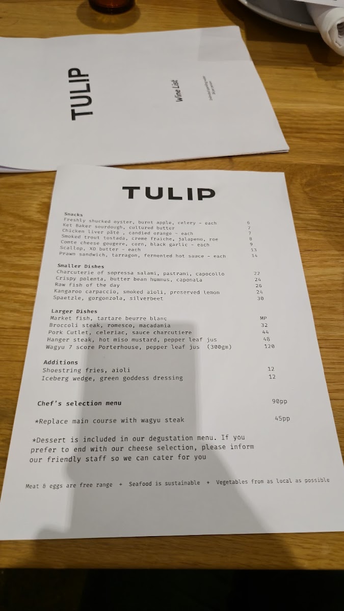 At Tulip Restaurant, the menu offers a refined yet approachable fine dining experience, centered on thoughtfully prepared Australian flavors. Guests can expect a selection of carefully crafted dishes, whether enjoyed as part of a degustation or a more casual meal. The plates are often composed of smaller, flavor-packed portions designed to be savored over time in the relaxed yet polished atmosphere of the restaurant.