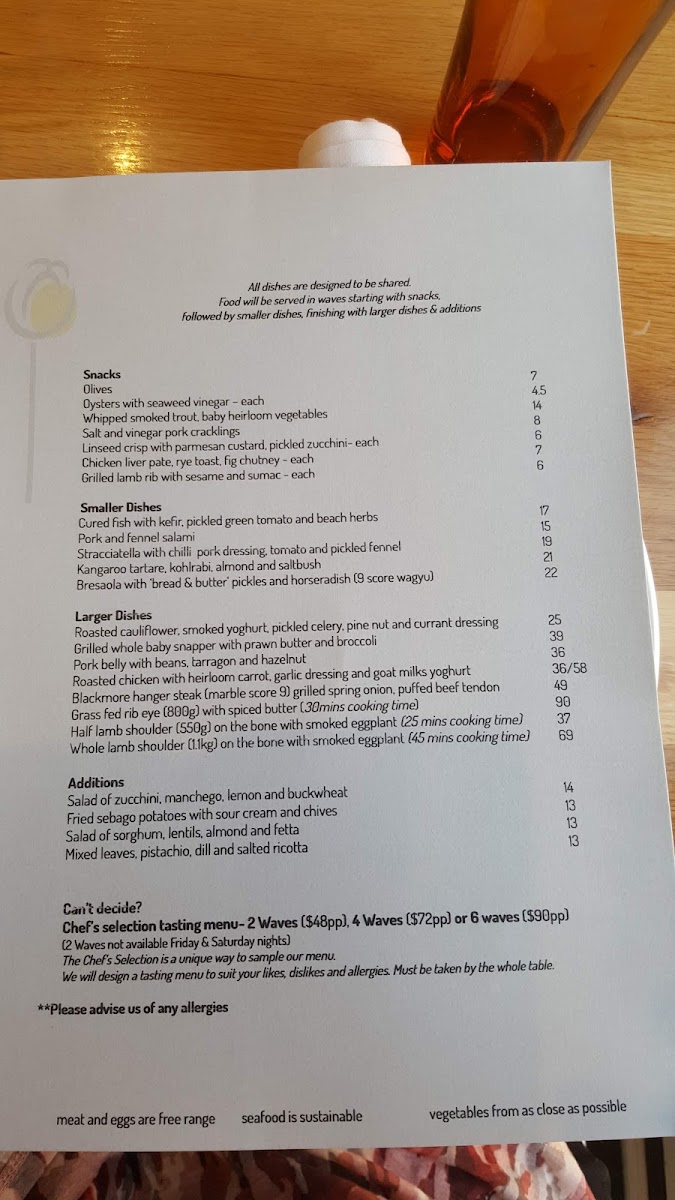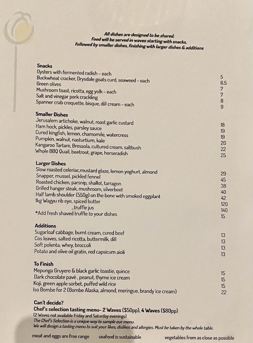 The menu features standout items like tender half lamb shoulder, freshly shucked oysters served with subtle accompaniments, and inventive takes on native ingredients such as kangaroo and barramundi wings. Seasonal produce like asparagus, kale, and rich ricotta appear regularly, reflecting a menu attentive to fresh, local sourcing.